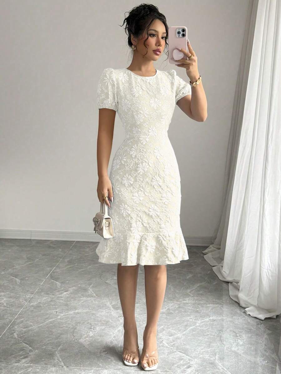 2025 Frühling Sommer Damen Sommer elegantes Jacquard-Texture einfarbiges Kleid mit rundem Ausschnitt, Rüschen, Puffärmeln und Knielänge