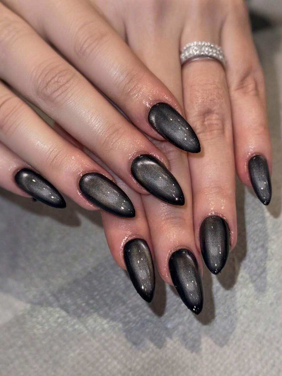 24 Stücke Katzenauge Nagel Aufkleber, mittlere mandelförmige Form, schwarz, wiederverwendbar, volle Abdeckung, minimalistischer Stil, glatte Oberfläche, geeignet für Frauen und Mädchen für den täglichen Gebrauch, Nagelbedarf