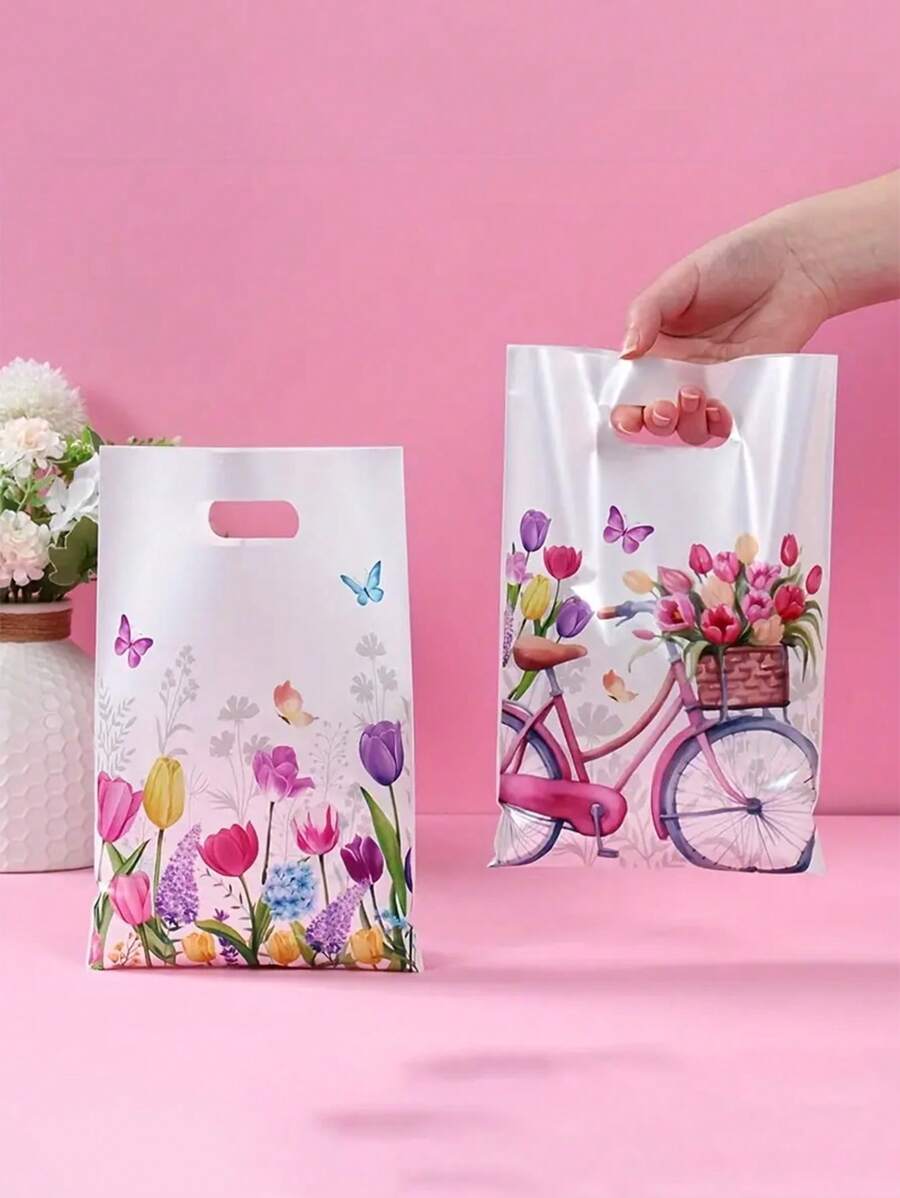 25 Stücke Tulpen Blumen Geschenktüte, frühlingshaftes Party Handtäschchen, Party Snack Rückgabe Geschenkverpackung Süßigkeitenverpackung, mit hellem Blumenmuster, 9.84* 6.49-Inch Verpackungstasche, geeignet für Feste, Geburtstage, Hochzeiten und Partys (Farbmischung)