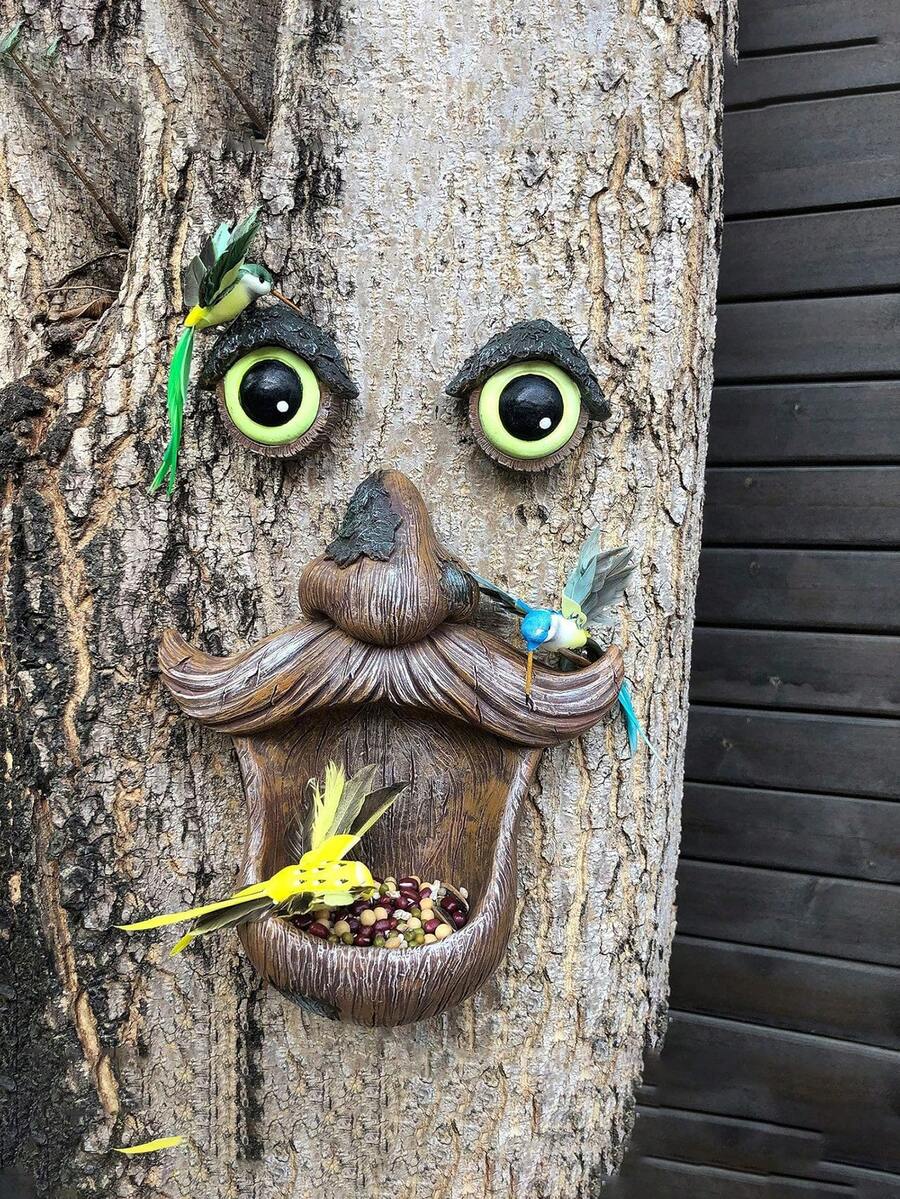3 Stücke Garten Harz Dekoration, Baum Gesicht Pflanzgefäß & Vogelfutterhaus mit Baumrinden Optik, geeignet für Außengarten, Hof, Baumstamm usw.