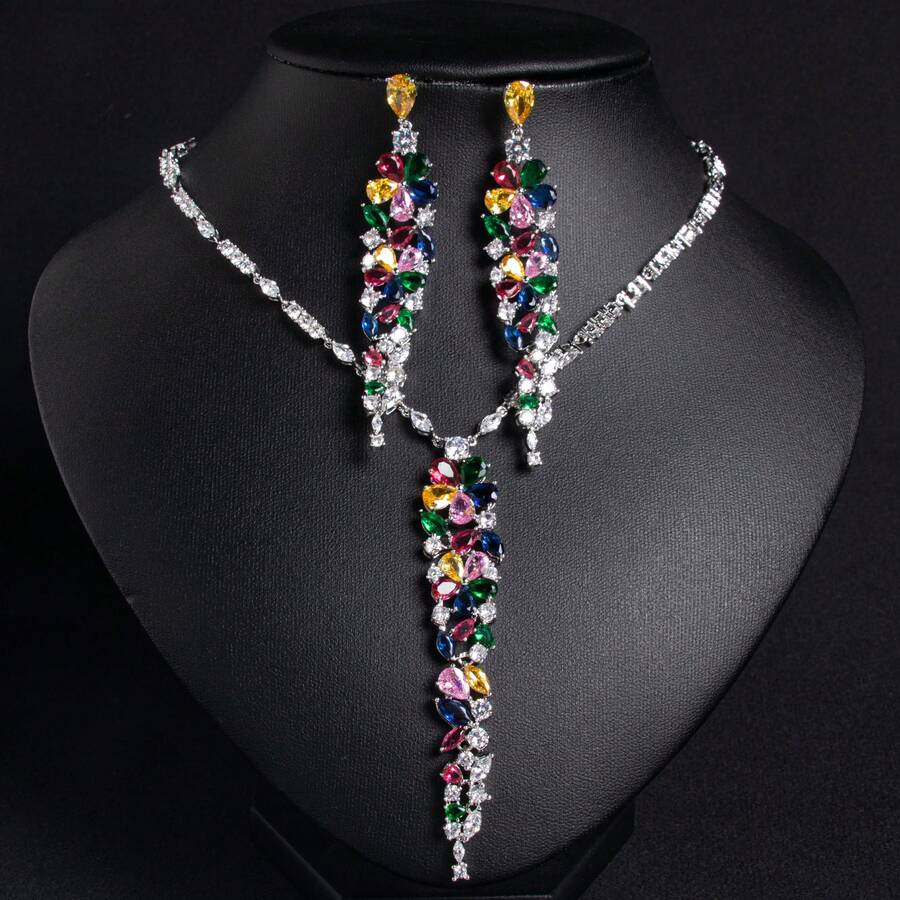 3 Stücke/Set, Mehrfarbige Optionen, Damenschmuck, Damenkette, Kupfermaterial, eingelegt mit synthetischem kubischem Zirkonia, Quastenform, Y2K-Stil, Ohrringe, Kette, Schmuckset, Ketten-Set, geeignet für Frauen Urlaub/Party/Bankett Tragen, Damenmode, Schmuckset, Geschenk