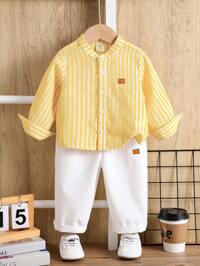 Cozy PixiesSHEIN 2 Stücke/Set Baby Khaki gestreiftes Hemd mit Kragen, Kurzarm Strick-Top & Hose Set, bequem und vielseitig, geeignet für Innen, Außen, Alltag, Sport, Spiel, Party, Fotoshooting, Urlaub, Frühling/Sommer Baby Jungen Leinen Set Baby Jungen Sommer Set Baby Jungen Outfit