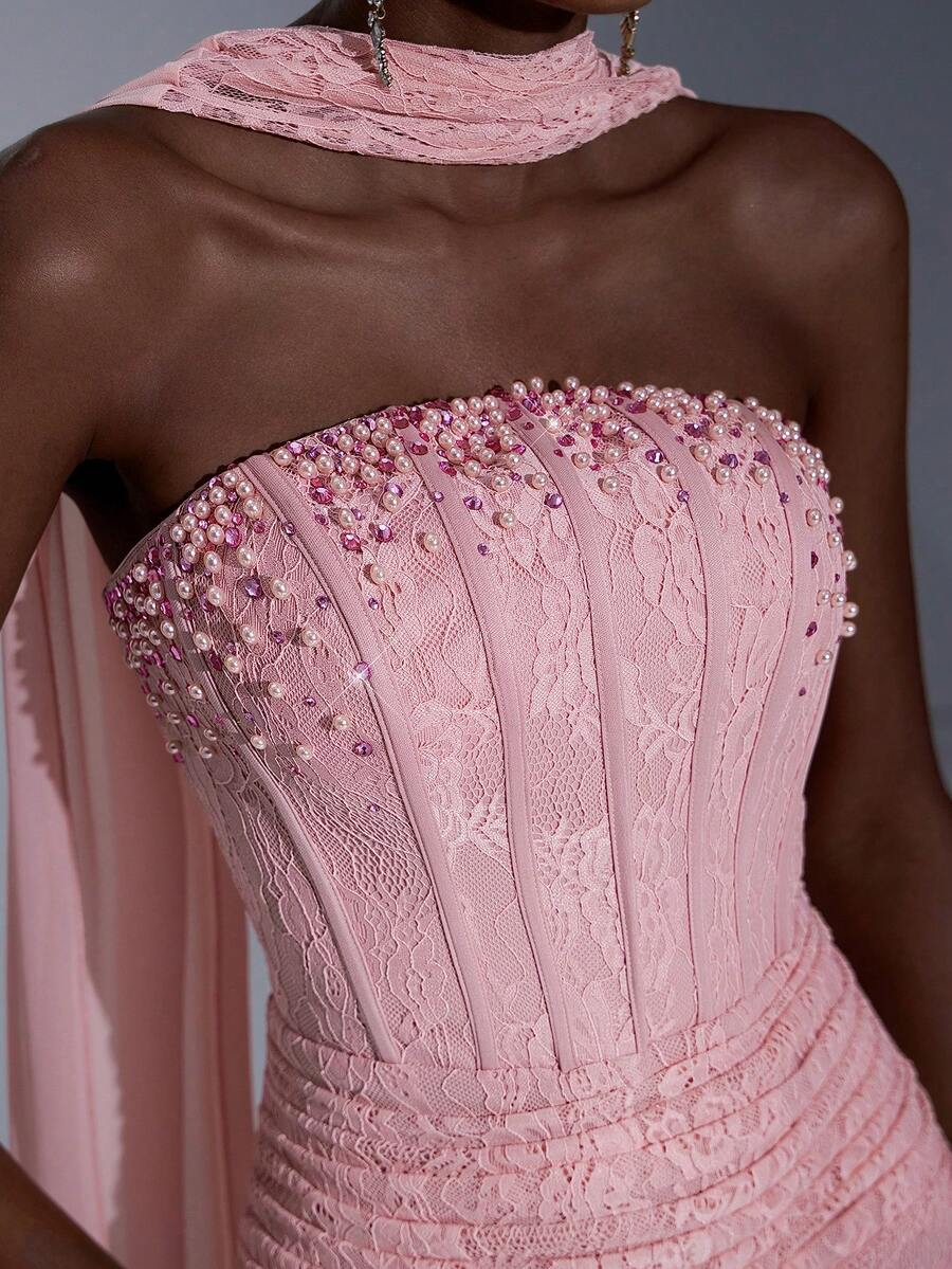 Elitara Elegantes, luxuriöses, dehnbares Spitzen-Bustier mit Formung, betonter Ausschnitt, reich verziert mit Strass und abnehmbarem perlenbesetztem Träger, taillenschmeichelnder plissierter Fischschwanzsaum Kleid, geeignet für Hochzeiten, Singles-Partys, Urlaub, Galas, festliche Anlässe