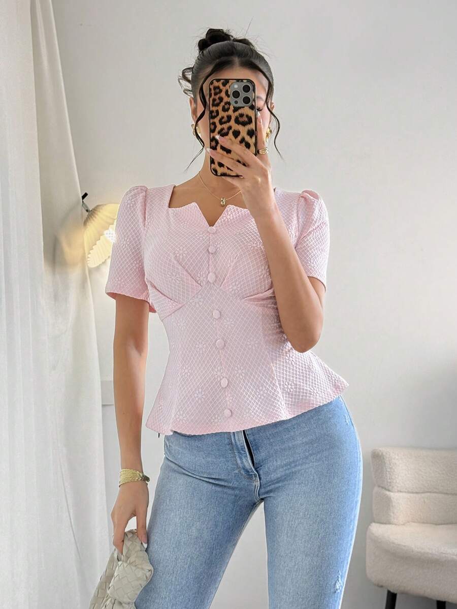 Firerie Damen neue kombinierbare Einfarbige quadratische Ausschnitt Struktur Jacquard Oberteil, elegantes Sommer Blumen Oberteil/Süße Sommer Oberteile/Sommer Outfits für Frauen/Boho Frauenkleidung/Strandurlaub Outfits/Festival Outfits/Sommerurlaub am Meer Outfits/Festival Kleidung