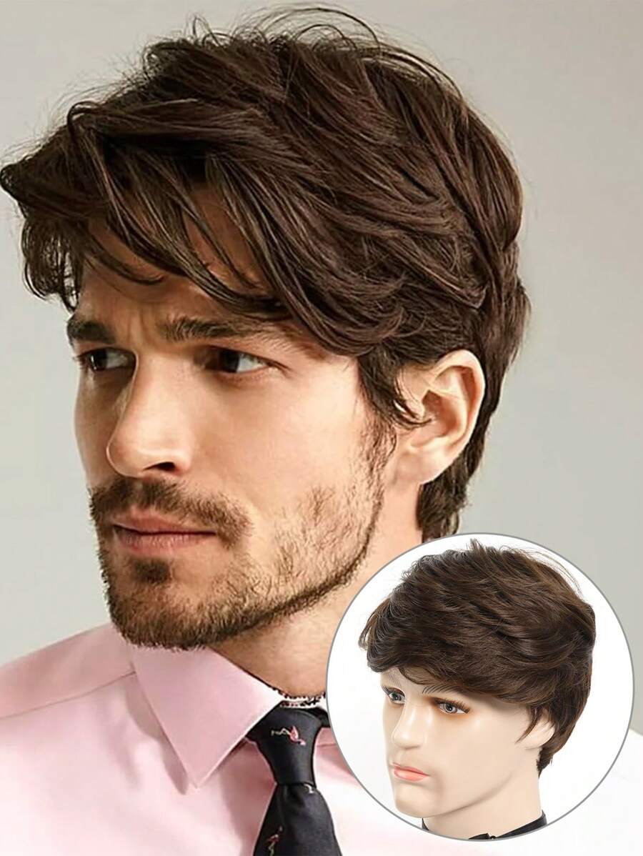 Männlicher modischer Kurzhaarschnitt mit Pony und strukturierter Schichtung, braune Farbe, 10 Zoll, geeignet für den täglichen Gebrauch oder als Halloween Kostümperücke.