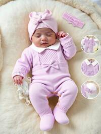Vintaside KidsSHEIN Vintaside Kids Neugeborenen Baby Strickjumper, Langarm gestrickter Jumpsuit mit Kragen + gestrickter Hut, geeignet für Herbst/Winter, apricotfarben, vielseitig für den täglichen Gebrauch, Twist Seil & Kabel Design, elegant & süß, geeignet für Zuhause, Ausflüge, Reisen, Kinderbetreuung