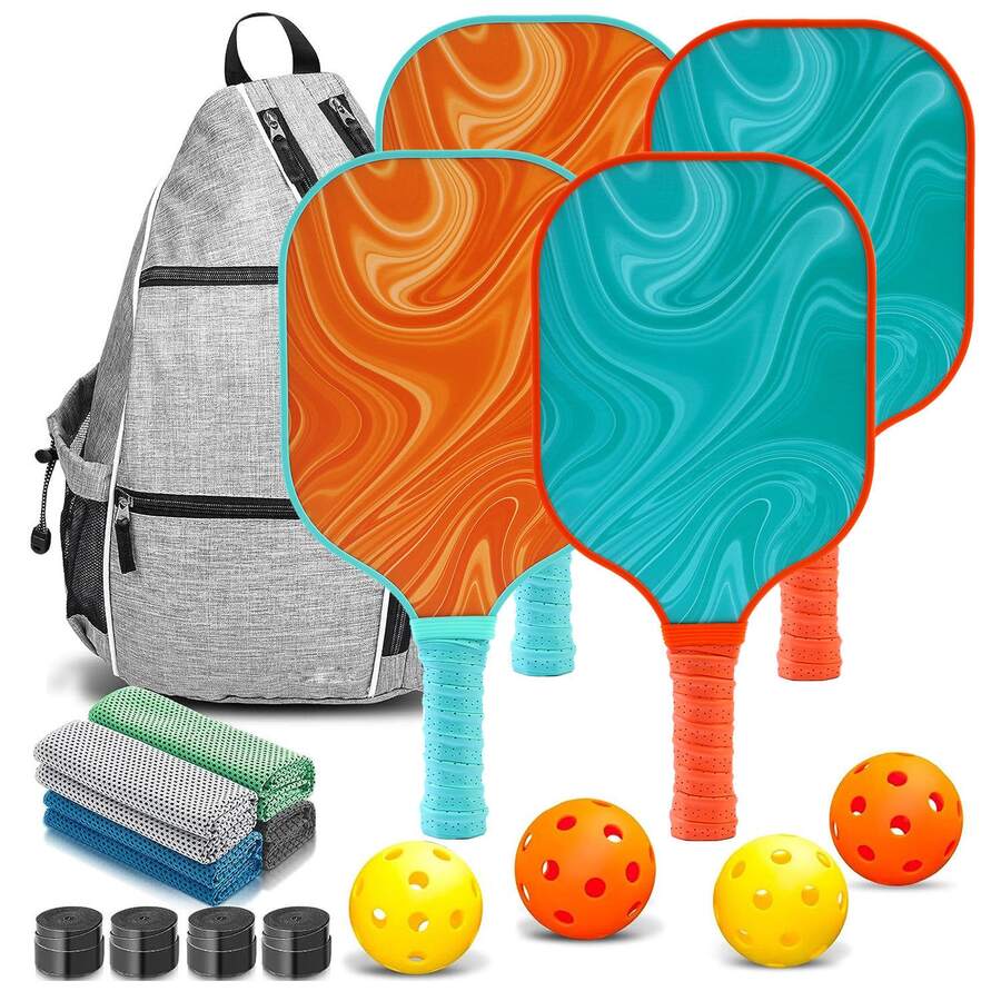 Pickleball Schläger Set - 4 Fiberglas Schläger mit Wabenkern, 4 Bälle, 4 Griffe, 4 Handtücher & Tragetasche - Starter Set für Innen- und Außenbereich für Anfänger & Familien