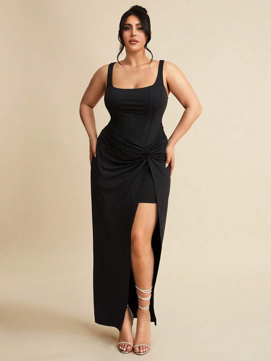 SHEIN BAE Große Größen Midi-Kleid mit Fischgrätenstruktur und Wickeloptik in Schwarz für Damen, Frühjahr/Sommer, Kleid mit Twist-Knoten-Vorderseite und Teilungsfalten, Minikleid für Abschlussball, dehnbares Minikleid, Kleid im französischen Stil, Abendkleid, Geburtstagskleid, Brautjungfernkleid, elegantes Alltagskleid, Hochzeitsgast-Kleid, Brautjungfernkleid, Partykleid, Korsage-Kleid