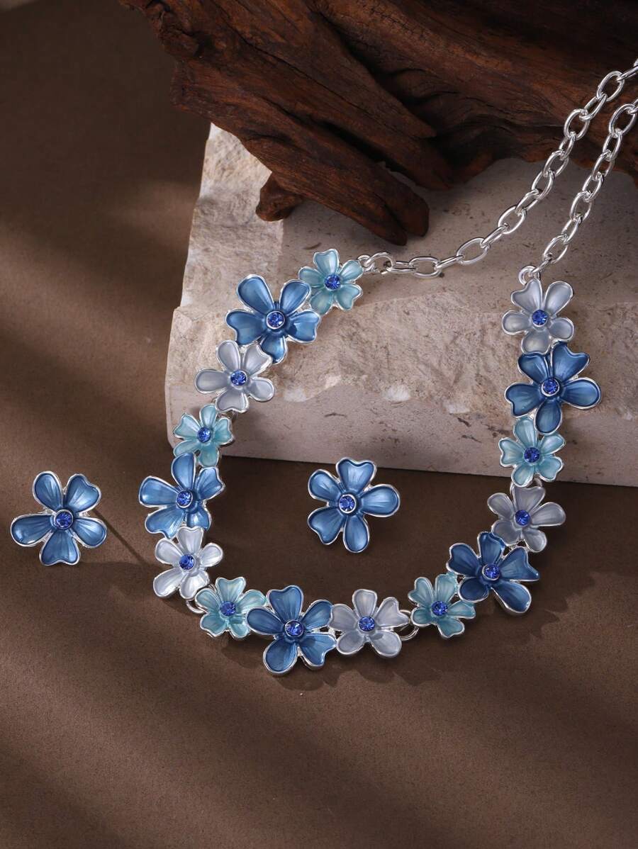 SophiaXuan 1 Set 2 Stücke Schmuckset im Boho-Stil, elegant, schlicht, niedlich, aus blau emaillierter Zinklegierung mit Blumenmotiv, bestehend aus Halskette und Ohrringen, geeignet für den täglichen Gebrauch von Frauen, Partys, Valentinstag Geschenk