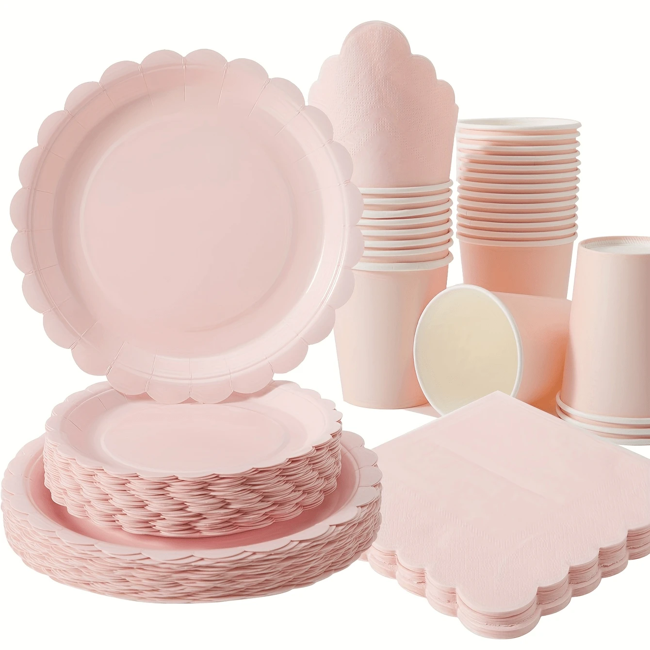 Dieses 100 Stücke rosa besticktes Einweg-Geschirr-Set beinhaltet 25 Dinner-Teller, 25 Dessert-Teller, 25 Papierbecher und 25 Servietten. Dieses praktische Geschirr-Set ist perfekt für Camping, Picknicks, Garten-Grillabende, Hochzeiten und Geburtstagsfeiern.