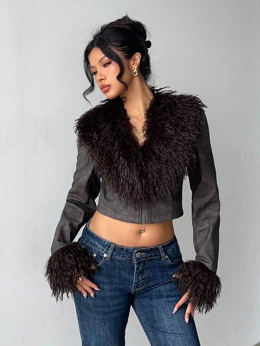 Aloruh Damen Jacke für Herbst/Winter, modischer vintage-bohemian Kunstpelzkragen Patchwork gewaschenePU-Lederjacke