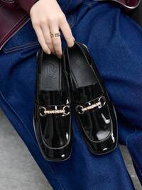 Vielseitige Damen Slipper mit quadratischer Zehenkappe, Schleifen-Dekor und niedrigem Absatz, Spiegelmaterial, quadratische Zehenkappe, Schlüpfen, einteilig, niedriger Absatz, retro-eleganter britischer Stil, 2025 Neu Frühling, Sommer, Herbst, Winter schwarzer Glanz, weiche Sohle, komfortable mittlere Absätze #1 Bestseller