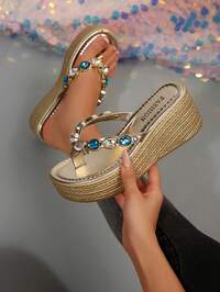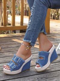 Damen Sommer neue rutschfeste, strapazierfähige, bequeme und atmungsaktive Plateau-Keilsandaletten, Gummisohle mit Metallschnallen Dekor, gewebte Slides, passend zu Shorts, Röcken, Leggings, Kleidern, für Frühling, Sommer, Herbst, blau, elegant, minimalistisch, Urlaub, Party, Reise, vielseitig tragbare Mode Plateau-Keilsandaletten #4 Bestseller