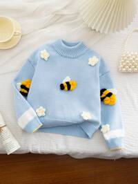 Kleine Mädchen Lässig, modisch und süß blauer gestrickter Pullover mit Blumen und Bienen, weich und bequem, geeignet für alltägliche Szenen, geeignet für Reiseszenen, geeignet für Urlaubsszenen, geeignet für Zuhause-Szenen, geeignet für Kinderzimmer-Szenen, geeignet für Herbst und Winter, Weihnachten, Schulanfang, Party, vielseitiger langärmeliger Stil, Frühling, Herbst und Winter Kleidung, Festivalkleidung für Mädchen