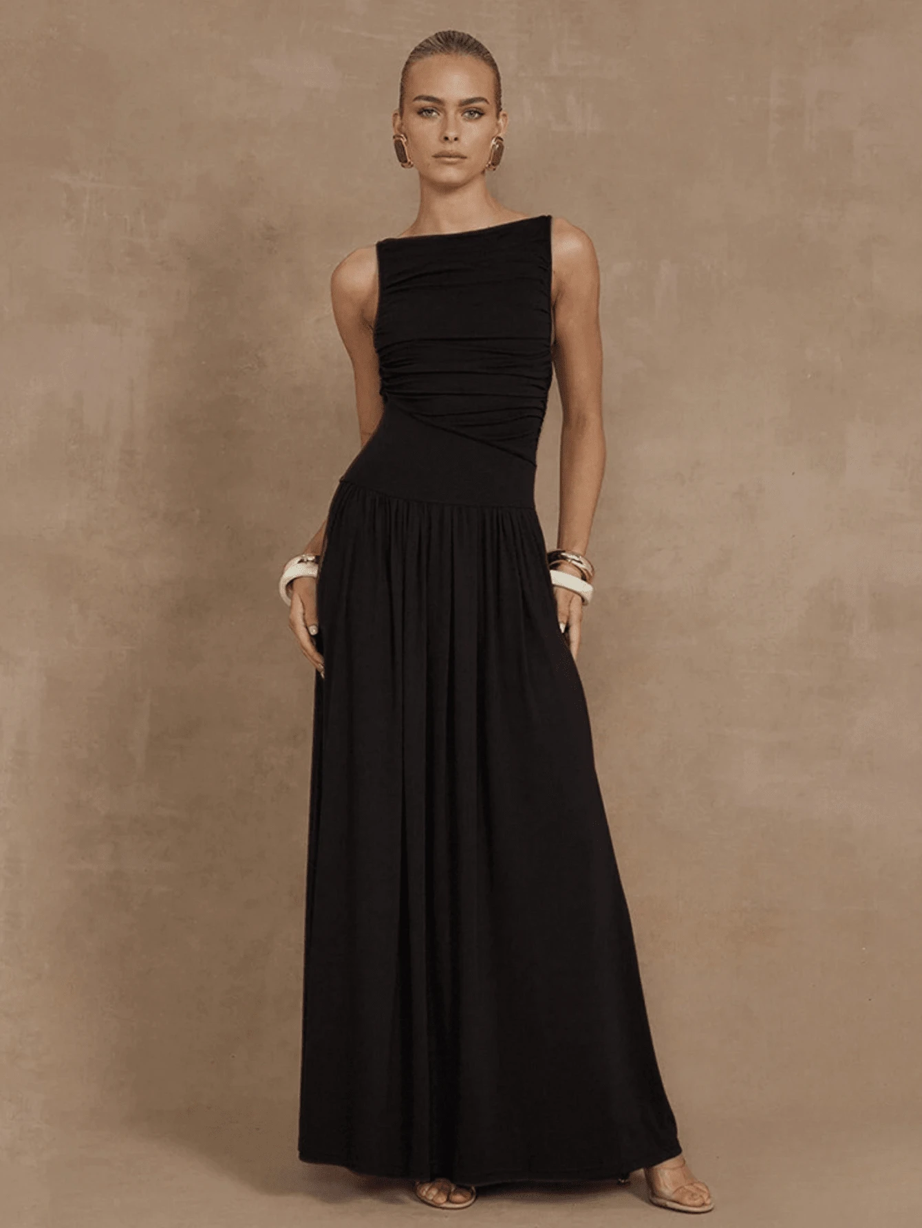 conciso Elegante ärmellose schwarze schlanke plissierte Damen Maxi Kleider mit Bootsausschnitt für Partys im Sommer